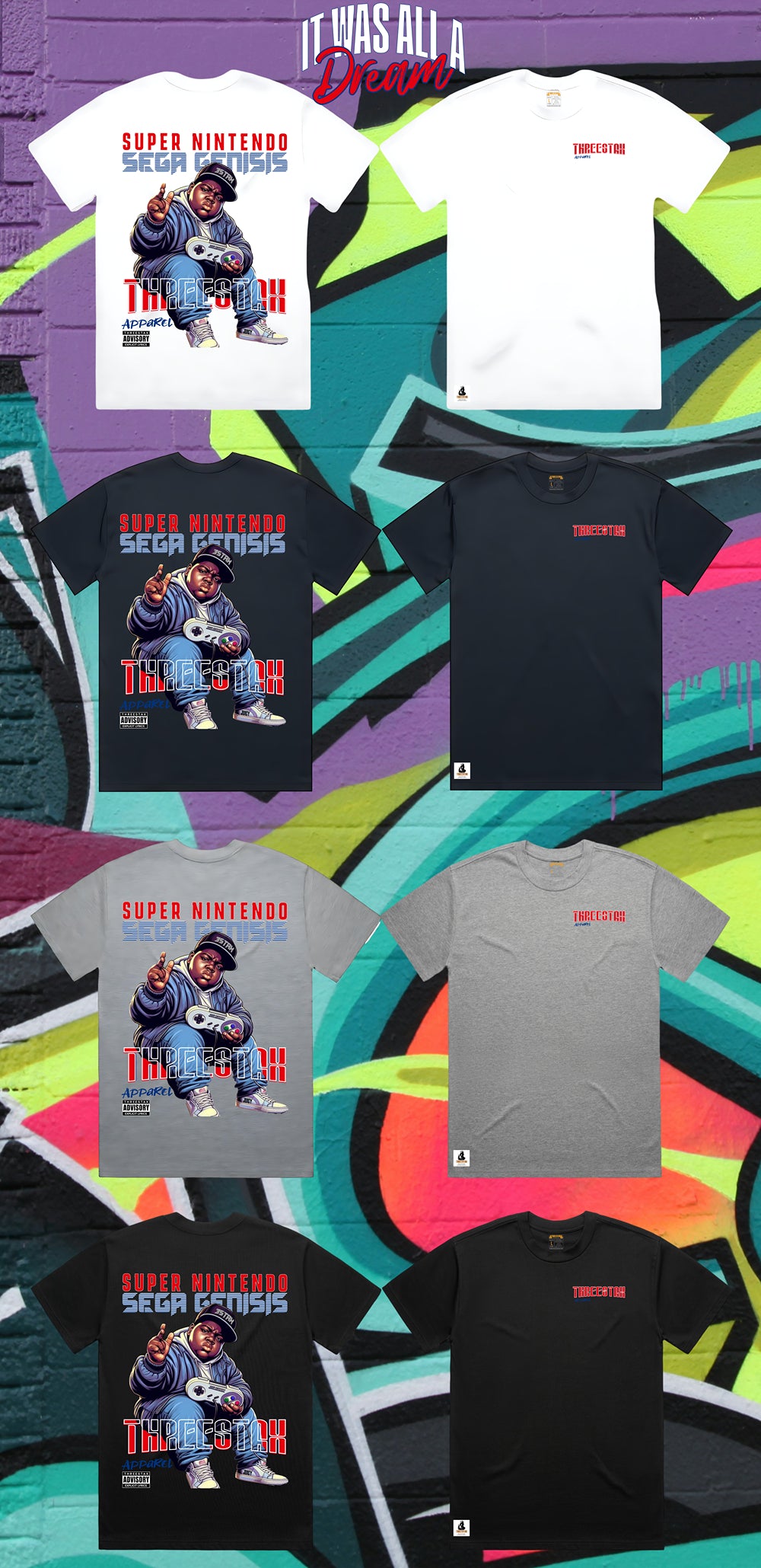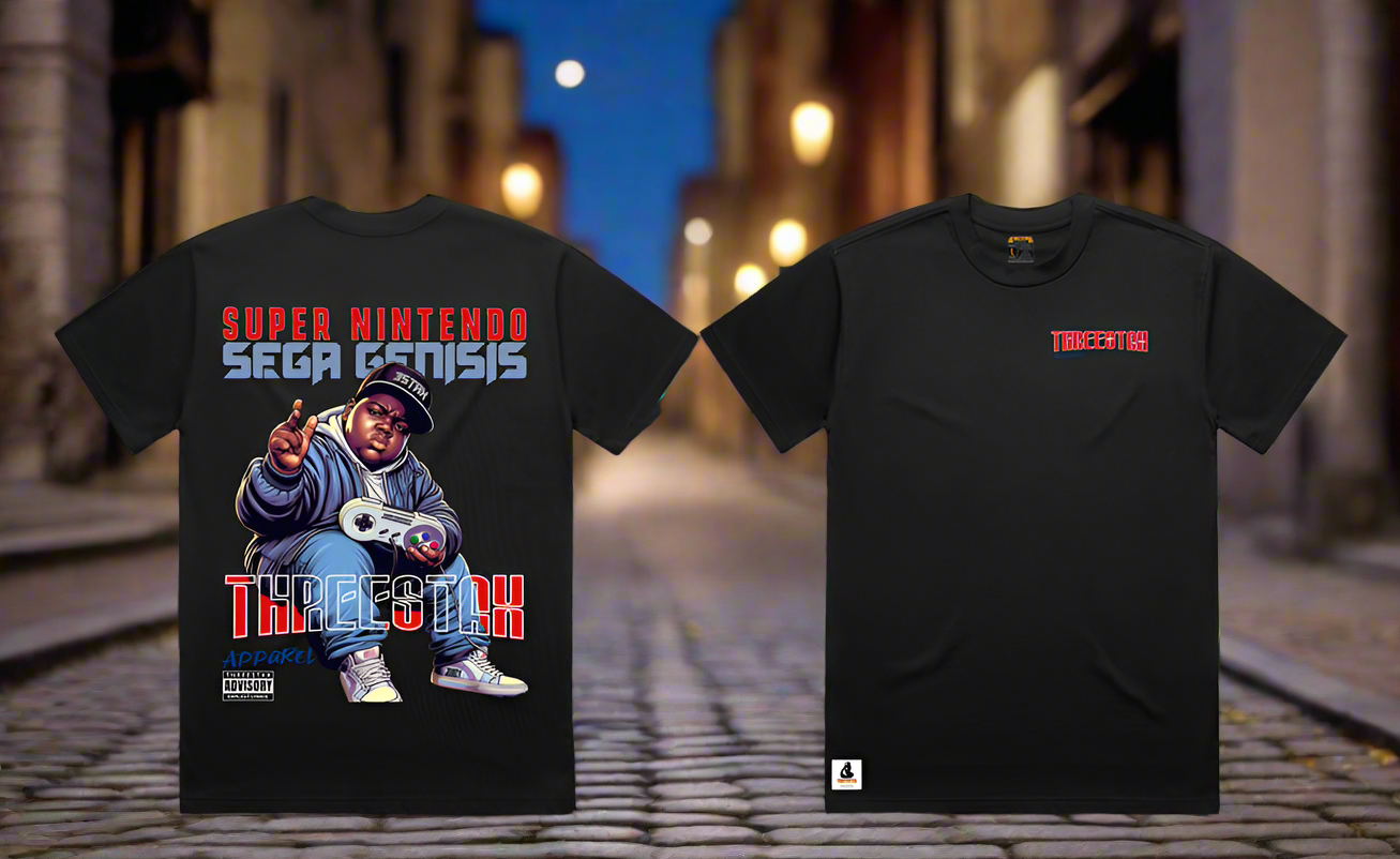 This tee is a tribute to the dreamers who grew up on 16-bit beats and boom bap bars. The IT WAS ALL A DREAM THREESTAX tee blends retro gaming nostalgia with streetwise storytelling, layered in graffiti textures and cultural pride.